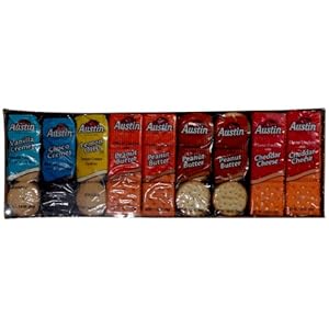# Austin Cookies & Crackers Variety Pack includes: Choco Cremes® Chocolate Cookies - 5/1.8 oz. pkgs # Vanilla Cremes Cookies - 5/1.8 oz. pkgs # Lemon Ohs!® - 5/1.8 oz. pkgs # Cheese Crackers with Peanut Butter - 10/1.38 oz. pkgs # Toasty Crackers with Peanut Butter - 10/1.38 oz. pkgs # Cheese Crackers with Cheddar Cheese - 10/1.38 oz. pkgs